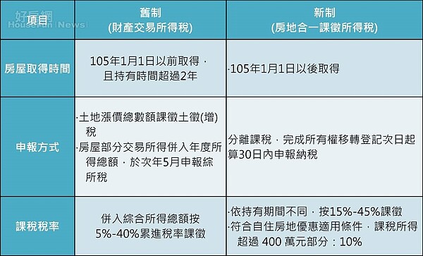 今年適逢房地合一新制上路後的第三個報稅年度,在107年售屋者,須確認售屋所得適用舊制或新制,永慶房屋契約部資深經理陳俊宏提醒,房屋若在105年1月1日以前取得,且持有時間超過兩年,就適用舊制,則納入綜合所得稅申報財產交易所得,必須在5月報稅時報繳;若適用新制,則是課徵房地合一稅,必須在所有權移轉登記次日起30日內申報,就不是在5月綜合所得稅報稅,納稅人須特別留意。